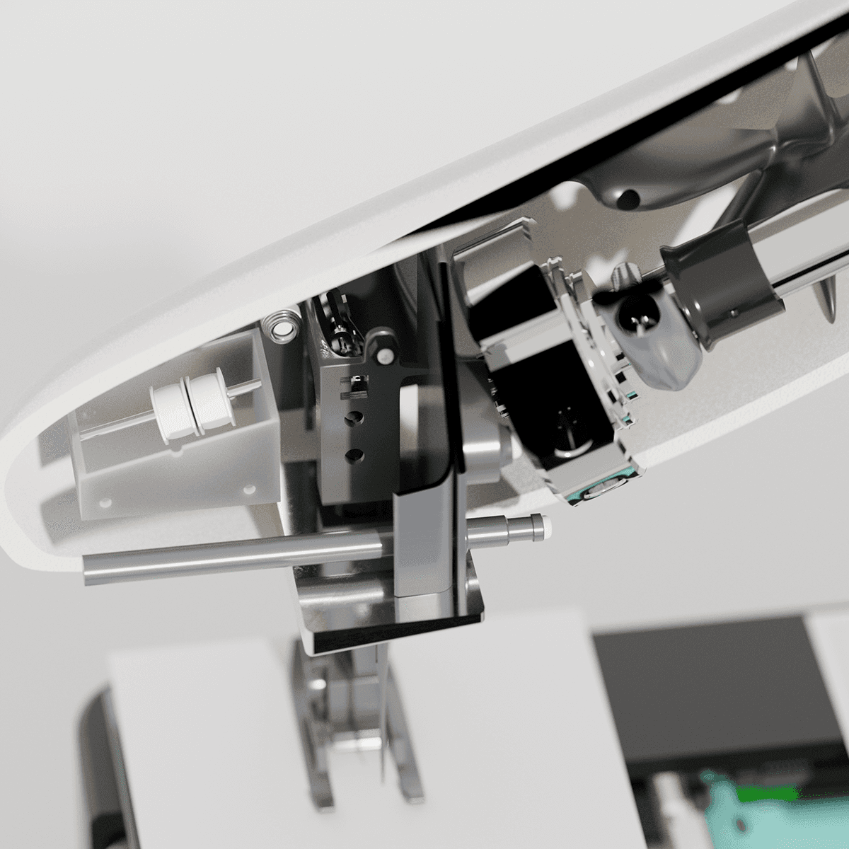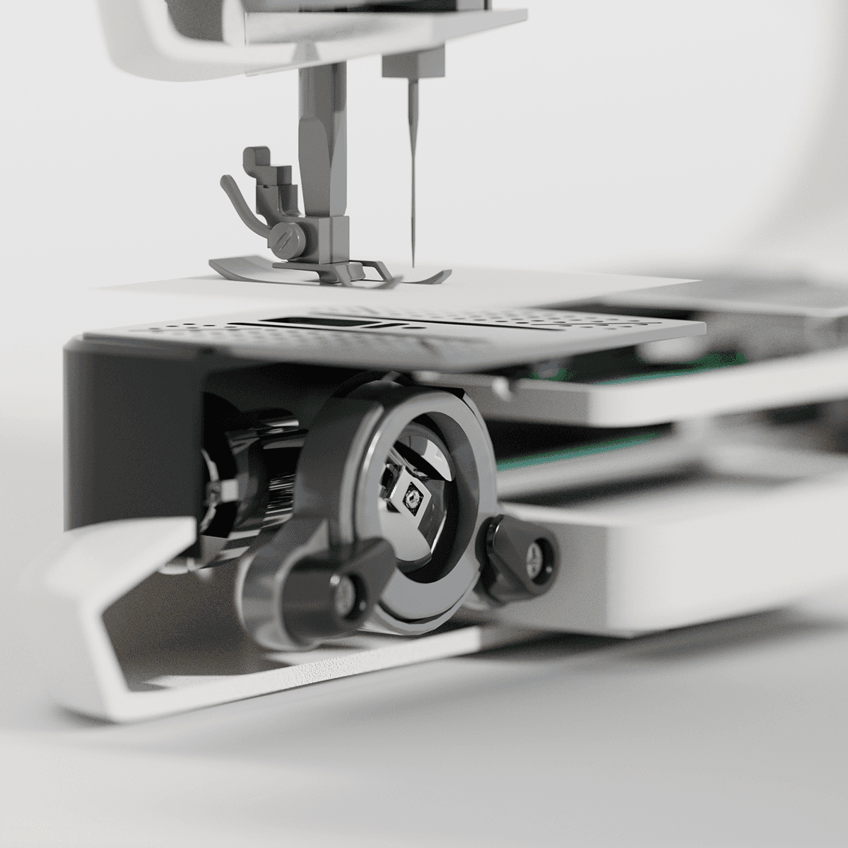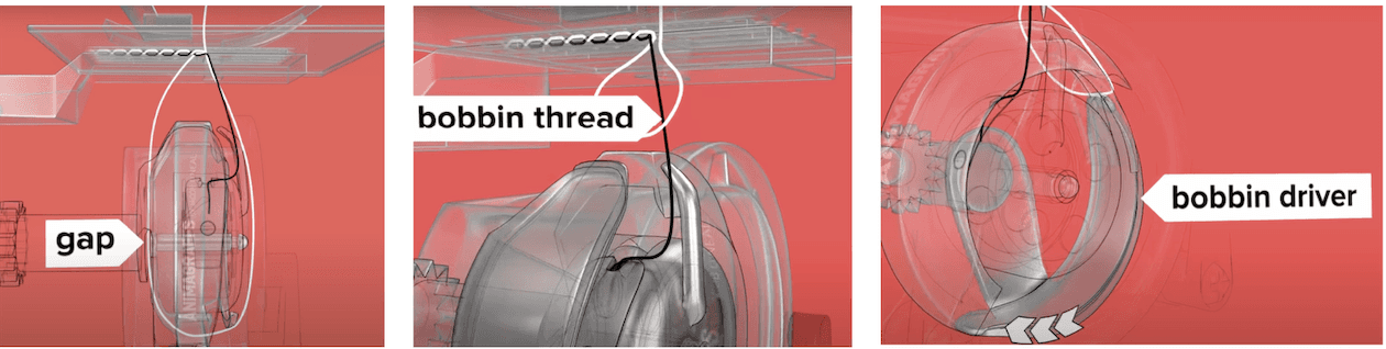 The floating shuttle hook is powered by the bobbin driver, which first pushes on one side of the shuttle hook, creating a gap through which the thread can pass. It then pushes on the opposite side, allowing the thread to escape and complete the loop. Meanwhile, a retaining ring, with a notch to keep the bobbin stationary, ensures that the bobbin does not rotate unnecessarily. The thread passes through this notch as it moves around the shuttle hook and bobbin assembly.
