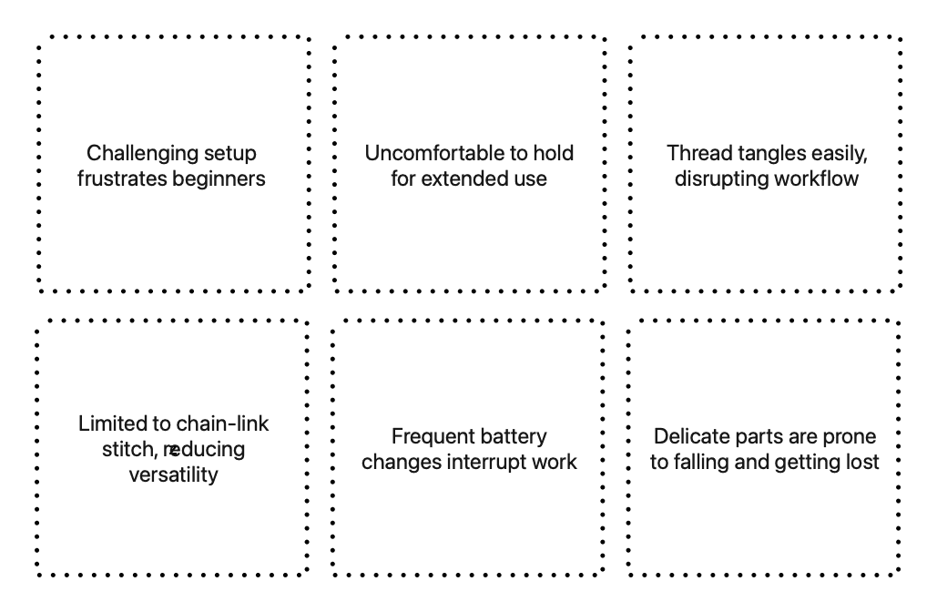 "Okay now I understand how a sewing machine works, what are the benefits and pitfalls of existing solutions, and who is my target user base. I feel like understanding issues through my target user base would yield me understanding of the actual problems, let's hear them out!"